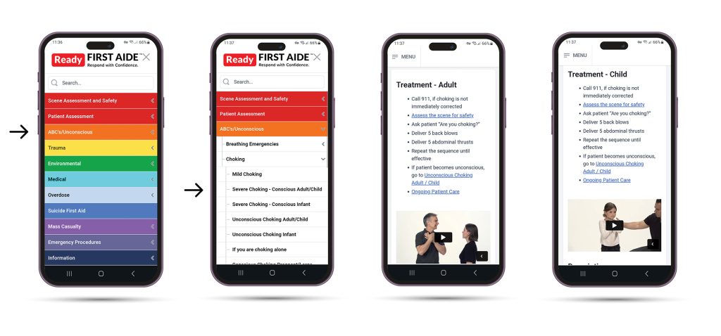 That’s why choking is a key part of the ABC’s / Unconscious Category inside the Ready FIRST AIDE™ web app. Within this section, you’ll find eight sub-topics that guide you through the right steps for different choking situations, including: