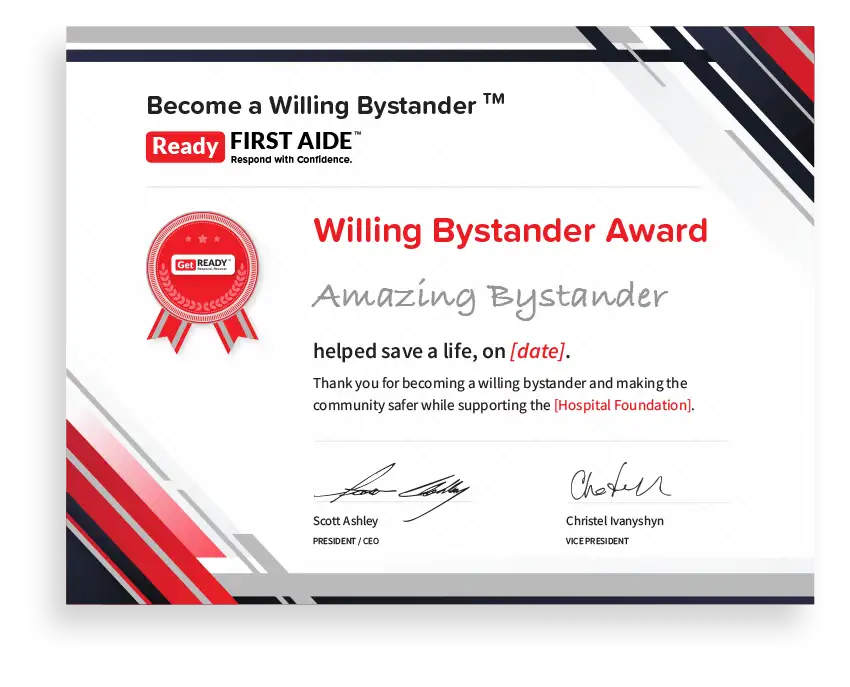 - Get Ready prepares the Willing Bystander Award certificates for patients and their families to present to the Willing Bystander(s) as a show of their thanks and gratitude for helping.